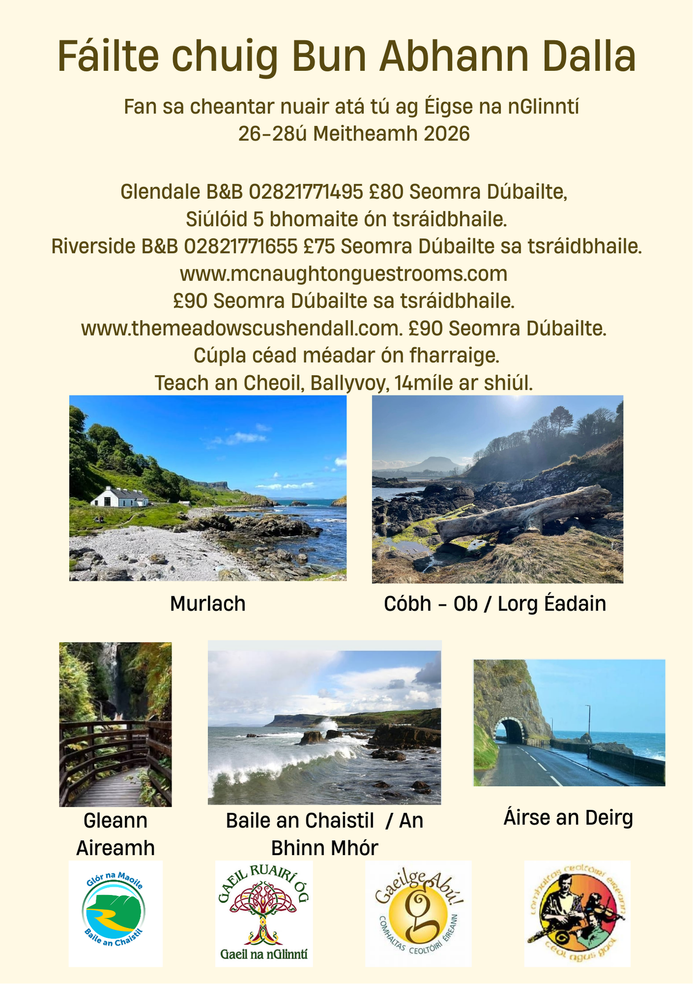 Tar ar ais chuig an suíomh chun tuilleadh eolais a fháil faoin Éigse, áiteanna le stopadh i mBun Abhann Dalla agus rudaí eile a mbeidh ar siúl agus curtha sa chlár. Tá muid ag dúil le deireadh seachtaine iontach sna Glinntí Aontroma.